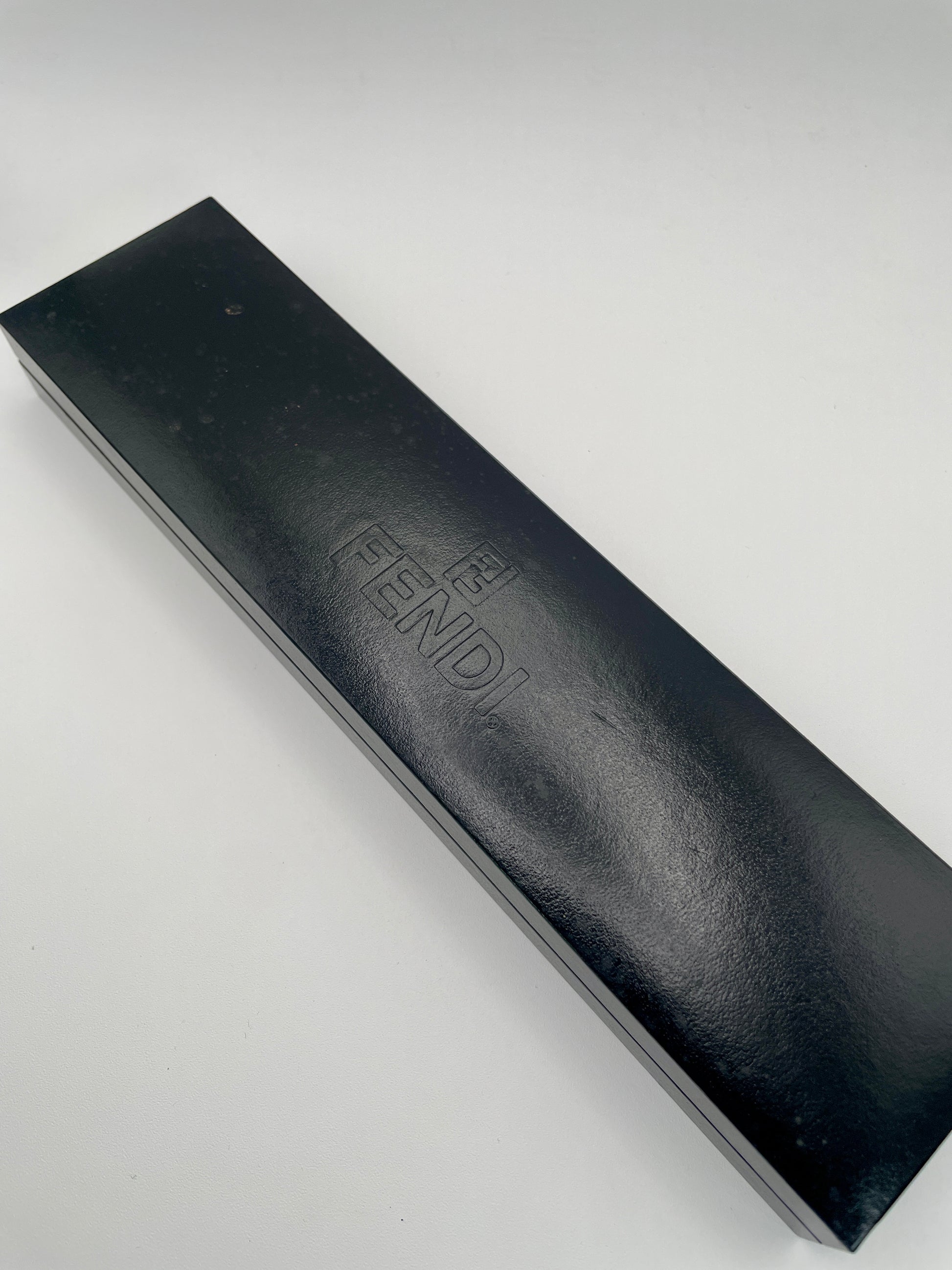 This Fendi 300J Vintage Women’s Watch combines understated elegance with distinct design elements characteristic of the Italian luxury house. Housed in a polished gold-tone case, the timepiece features a minimalist black dial accented with gold Roman numeral hour markers and dauphine hands. The standout triple lug detailing gives this piece a sculptural appeal, while the black leather strap with contrast stitching adds a refined vintage charm.